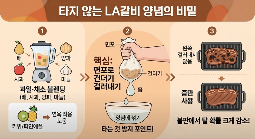 이렇게 하면 양념이 고기 표면에 고르게 스며들면서도 불판에서 탈 확률을 크게 줄일 수 있다. 실제로 많은 요리 전문가들도 갈비 양념에서 건더기를 제거하는 것을 포인트로 짚고 있다.