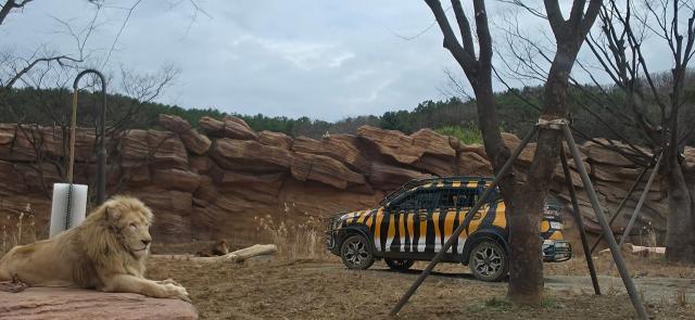 육중한 철문이 열리고 숲으로 미끄러져 들어가는 순간, 가장 먼저 체감되는 변화는 압도적인 '고요함'이다. 기존 디젤 트램의 덜컹거림 대신 새롭게 도입된 '친환경 EV 버스'의 조용한 주행 덕분에 마른 나뭇잎 밟는 소리와 사자의 묵직한 하울링이 고막을 생생하게 때린다. 거대한 탐험 차량은 호랑이, 사자, 반달가슴곰 콘셉트의 매력적인 외관을 뽐내며 맹수들의 숲을 은밀하게 누빈다.