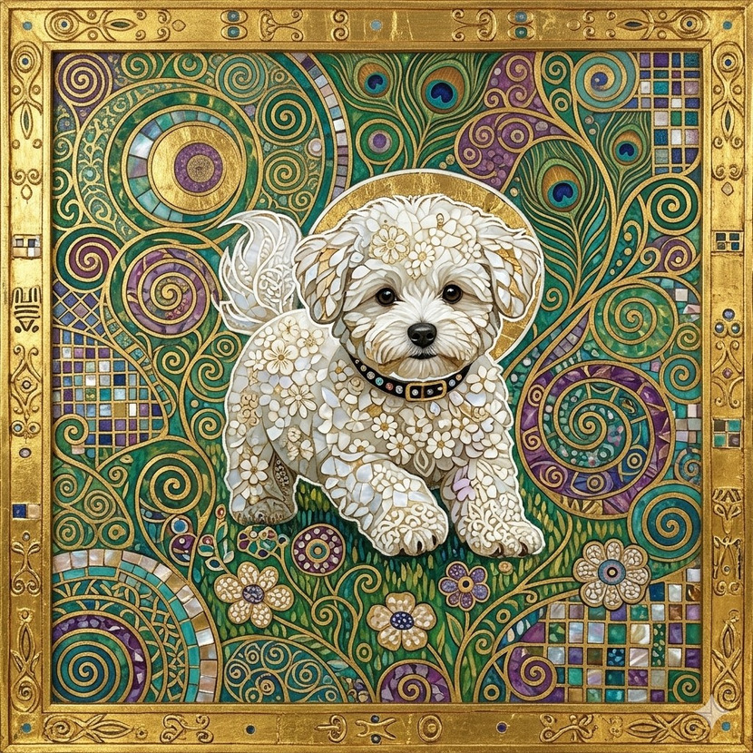 황금빛 '생명의 나무' 아우라: 배경을 가득 채운 황금빛 소용돌이 문양은 클림트의 상징인 '생명의 나무'를 형상화한 것입니다. 이는 비숑의 역동적인 움직임에 영원한 생명력과 신비로운 아우라를 부여합니다.