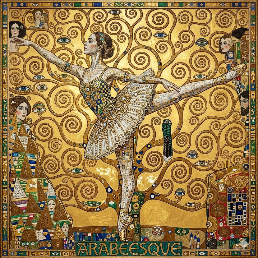 생명력이 소용돌이치는 황금 배경: 무용수를 감싸며 배경 전체를 휘감는 황금빛 소용돌이 덩굴은 클림트의 상징인 '생명의 나무'를 형상화한 것입니다. 이 역동적인 곡선들은 무용수의 손끝과 발끝에서 뿜어져 나오는 우아한 에너지가 온 우주로 퍼져나가는 듯한 신비로운 분위기를 자아냅니다.
