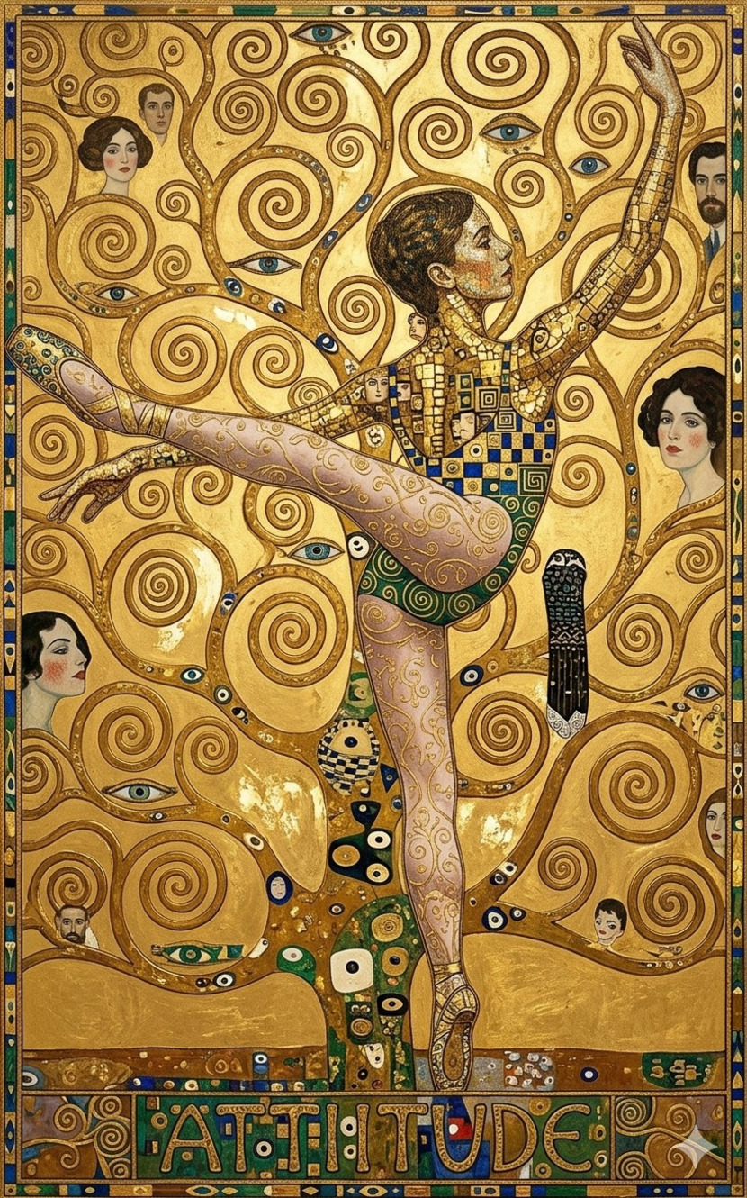 삶과 사랑의 서사가 담긴 자락: 화면의 양옆과 하단부에는 클림트의 대표작들을 연상시키는 연인들의 포옹과 관조하는 인물들의 초상이 장식되어 있습니다. 이는 무용수의 고독한 몸짓 뒤에 인류의 보편적인 감정인 사랑과 삶의 희로애락이 겹겹이 쌓여 있음을 예술적으로 보여줍니다.