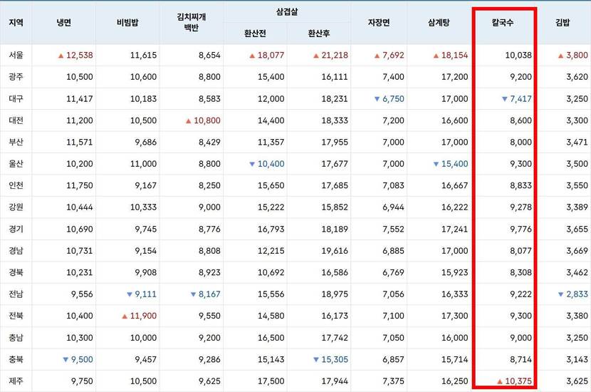 비빔밥은 전북(1만1900원)이 서울(1만1615원)보다 높았고, 김치찌개백반은 대전(1만800원)이 전국에서 유일하게 1만원을 넘기며 서울(8654원)보다 2000원 이상 비쌌다. 냉면은 서울(1만2538원)이 전국 최고가였고, 가장 저렴한 광주(1만500원)와는 2000원 넘게 차이가 났다.
