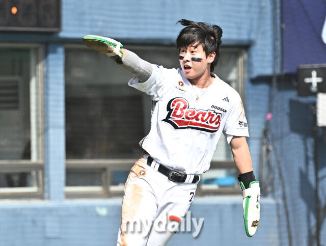 두산 박찬호가 5회말 2루타를 터뜨린 뒤 환호하고 있다./잠실=송일섭 기자
