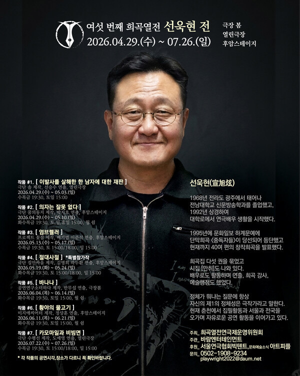 희곡열전 연극제 운영위원회는 오는 4월 28일부터 7월 26일까지 ‘선욱현전’을 개최한다고 밝혔다. 시인, 연출가, 배우로도 활동 중인 선욱현의 주요 희곡을 무대화한 작품들이 순차적으로 공연된다.