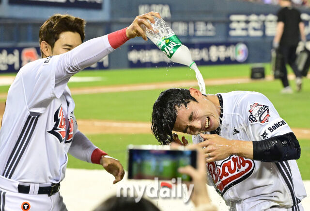 이유찬은 경기 후 웃더니 “여름에도 찬물로 샤워하는 사람인데…”라고 했다. 동료들의 시원한 찬물 세례가 특별했다. 그는 “외야수가 앞에 있는 것도 확인했고, 중견수가 김호령 선배여서 혹시 잡힐까 했는데 땅에 떨어지는 걸 보고 확신했다”라고 했다.
