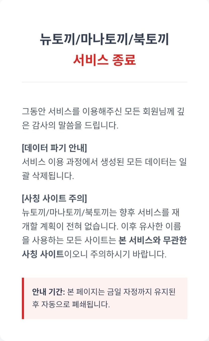 뉴토끼는 웹툰뿐 아니라 웹소설, 일본 만화까지 아우르는 복합 유통망을 구축해 왔다. 이러한 다층적 구조는 단일 사이트 폐쇄만으로 해체되기 어렵다. 현재 이들 사이트가 공식 운영을 중단한 상태에서도, 동일한 이름을 사칭한 사이트가 등장할 가능성이 있다. 접속이 가능한 유사 사이트는 개인정보 탈취를 노린 피싱 사이트일 가능성이 높아 이용자의 주의가 필요하다.