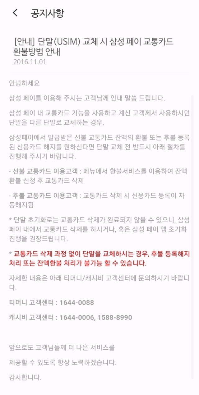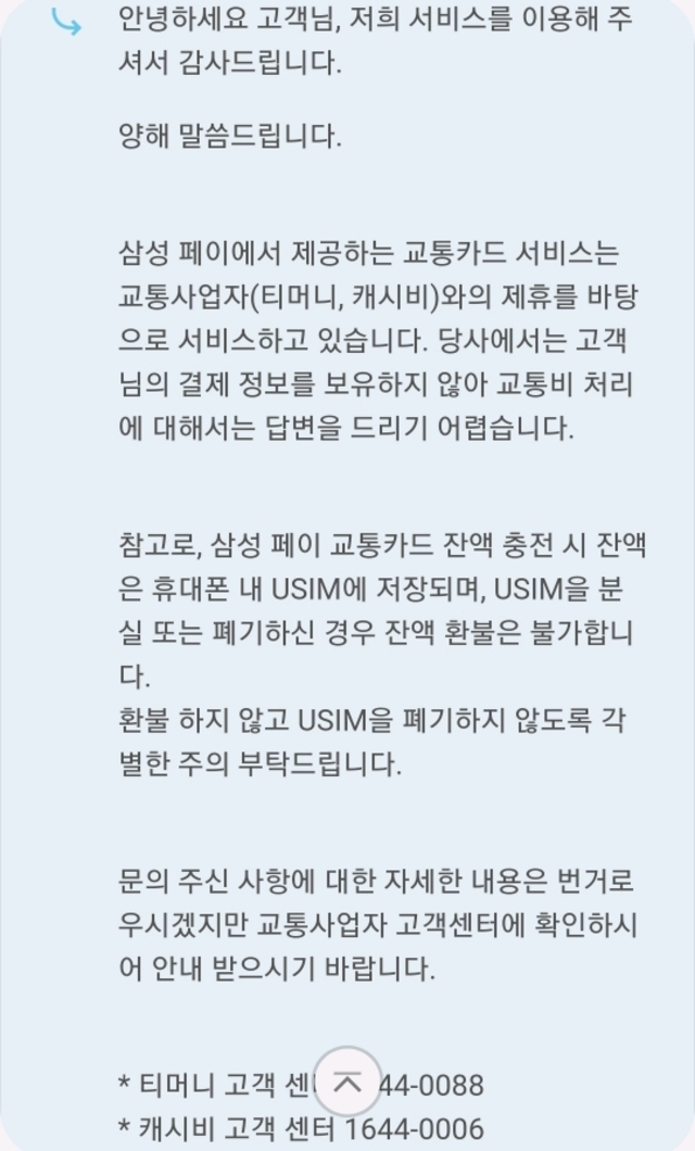 삼성페이/티머니측 둘다 방법이 없다고만함