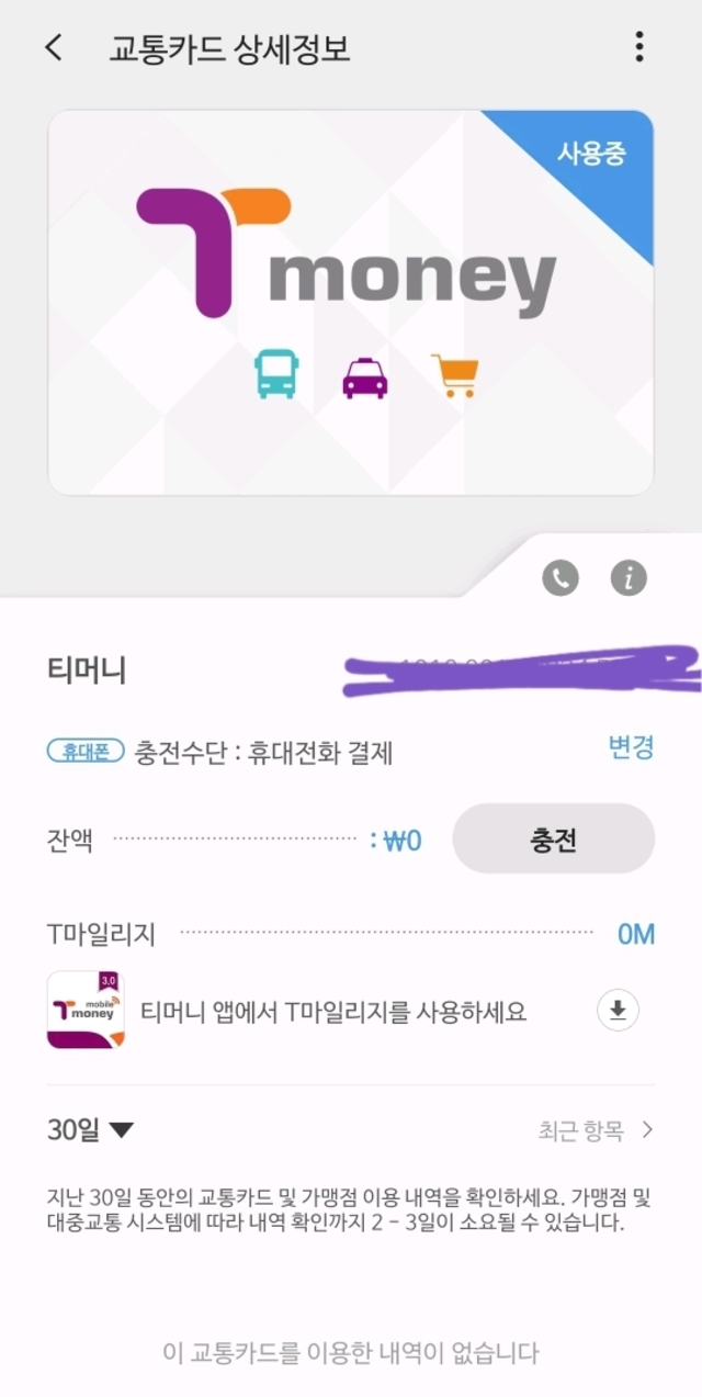 평소 삼성페이 교통카드(티머니) 선불충전해서