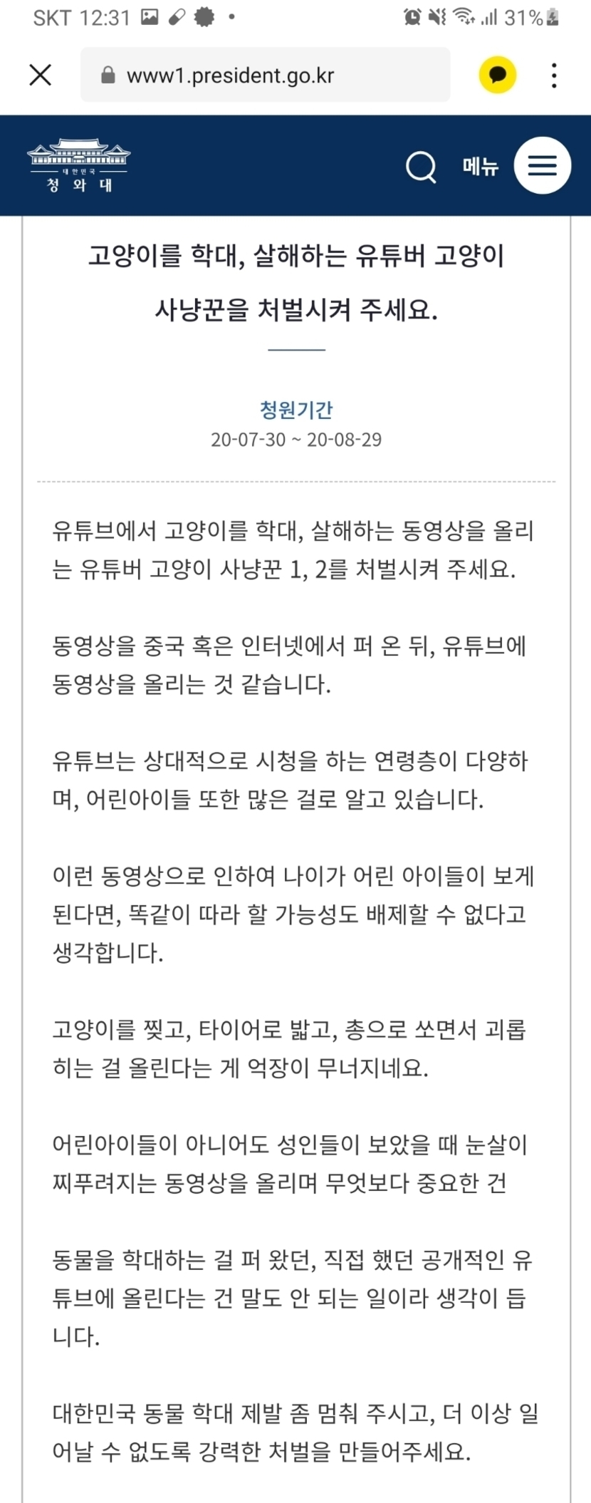 20.07.31 350 읽음 협조구합니다 0875421 구독하기 26 63 콘텐츠의 수익 27 https://www1.president.go.kr/petitions/Temp/6TfRWn⬆️⬆️⬆️ 클릭제가 올린 글은 아니고 부탁받았습니다만동물을 사랑하시는 분들께부디 청원에 동참 부탁드리며, 이 영상 찾아보진말아주세요잔인하기 그지없네요 음란물 아동학대도 동물학대도 보는이들, 퍼나르는 이들이라도 없어지길 바랍니다 63 0 / 300 입력