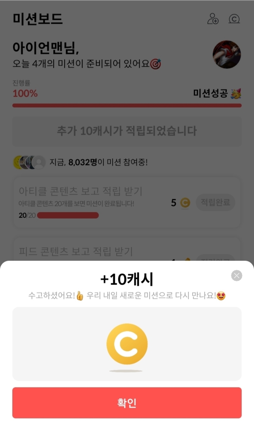 완료해서 10캐시 받았어요~