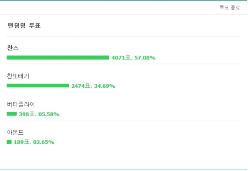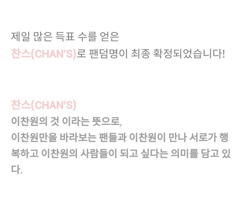 20.08.06 165 읽음 찬스 여러분~~ 문문문대 구독하기 6 17 콘텐츠의 수익 31 몇 일 공카 안 간 사이 팬덤명이 정해졌었네요ㅠ저도 투표 했었는 데 그걸 깜박하다니ㅠ찬원이 팬덤명은 '찬스'입니닷!언제 생길까 기다렸는 데!! 예쁜 이름이 생겼네요^^찬스 여러분 오늘도 이찬원 하세요! 17 0 / 300 입력