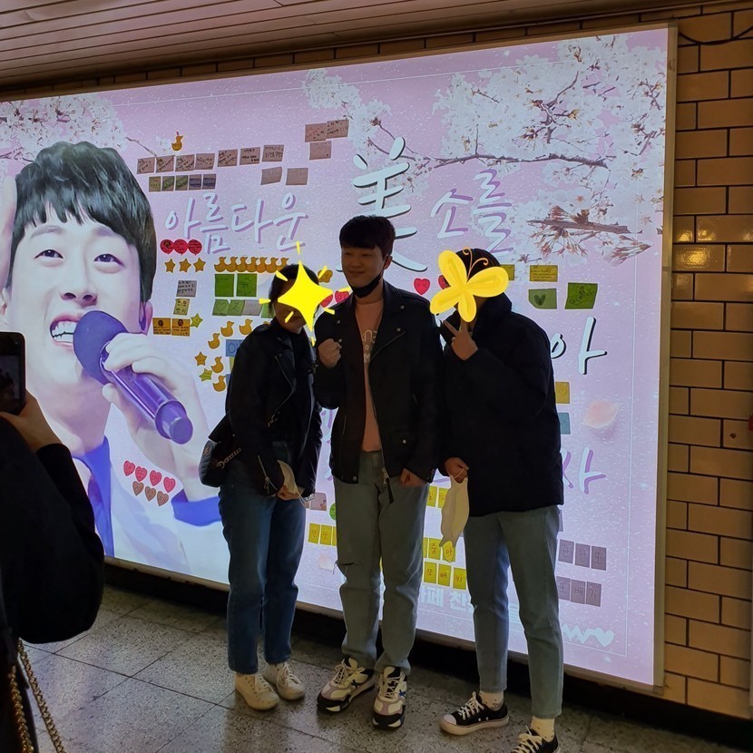 미스터 트롯이 종방하고 4월달 쯤인가? 우연히 잠실역인가 지나다가 사람이 웅성 웅성 모여있어서 봤더니 이찬원이 딱!!! 팬클럽에서 굉고하는 지하철 광고판을 구경하러 온 것 같다. 방송에서 같이 노래방을 갔었던 절친도 함께 왔다. 방속직후 급 인기가 올라가고 팬클럽도 생기니 약간 들뜨고 신기한 마음으로 본인의 전광판을 보러 온듯하다. ㅡ