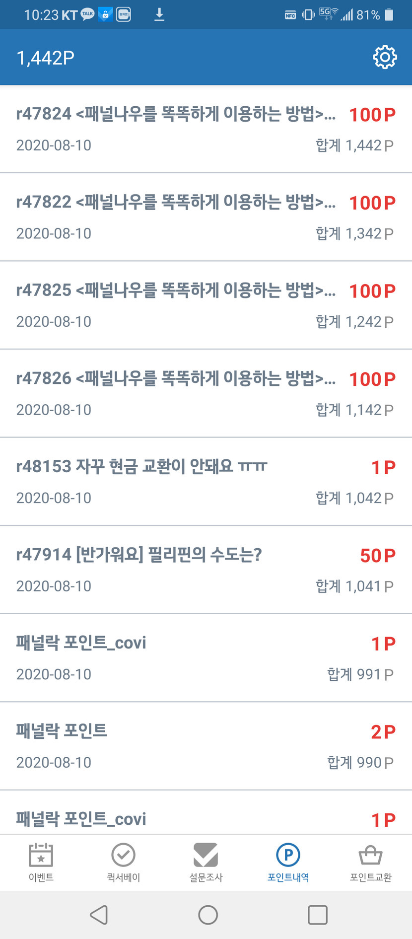 20.08.10 95 읽음 쏠쏠한 설문조사 어플 효그랜트 구독하기 3 9 콘텐츠의 수익 6 설문조사를 하면 포인트를 주는 어플 패널나우.시작한지 오늘이 4일째.벌써 포인트가 이만큼 쌓였다..1포인트당 1원이고 2000포인트부터 현금교환해서 계좌로 옮길수있다.개인적으로 추천하고싶은 어플이다. 9 0 / 300 입력