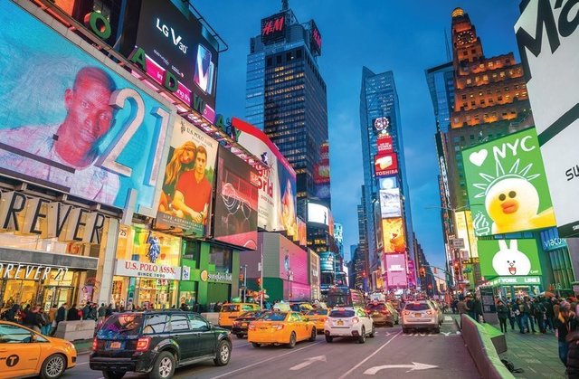 타임스 스퀘어가 특히 빛을 발하는 때는 전광판들이 두드러지는 밤이에요. 전광판들은 경쟁이라도 하듯 엄청난 빛을 뿜어냅니다.