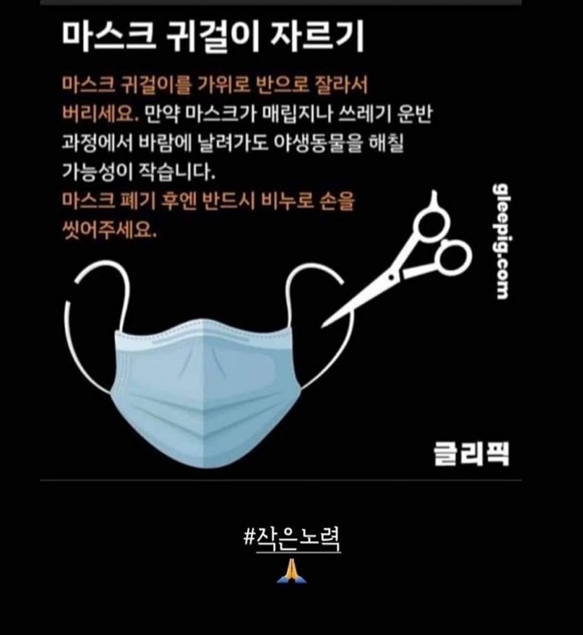마스크 버릴때 귀에 거는 끈부분을 꼭 잘라서 버려주세요