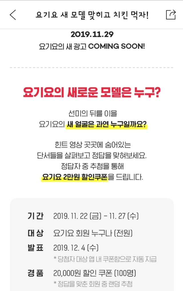 19.11.24 157 읽음 요기요 이벤트.모델이름맞히고 치킨먹자 🍰🍧날마다 좋은날🍰🍨 구독하기 3 5 콘텐츠의 수익 53 '요기요 새 모델 맞히고 치킨 먹자!' 요기요 앱에서 확인해보세요.https://www.yogiyo.co.kr/ss/GHIsJk정답 박소담 5 0 / 300 입력