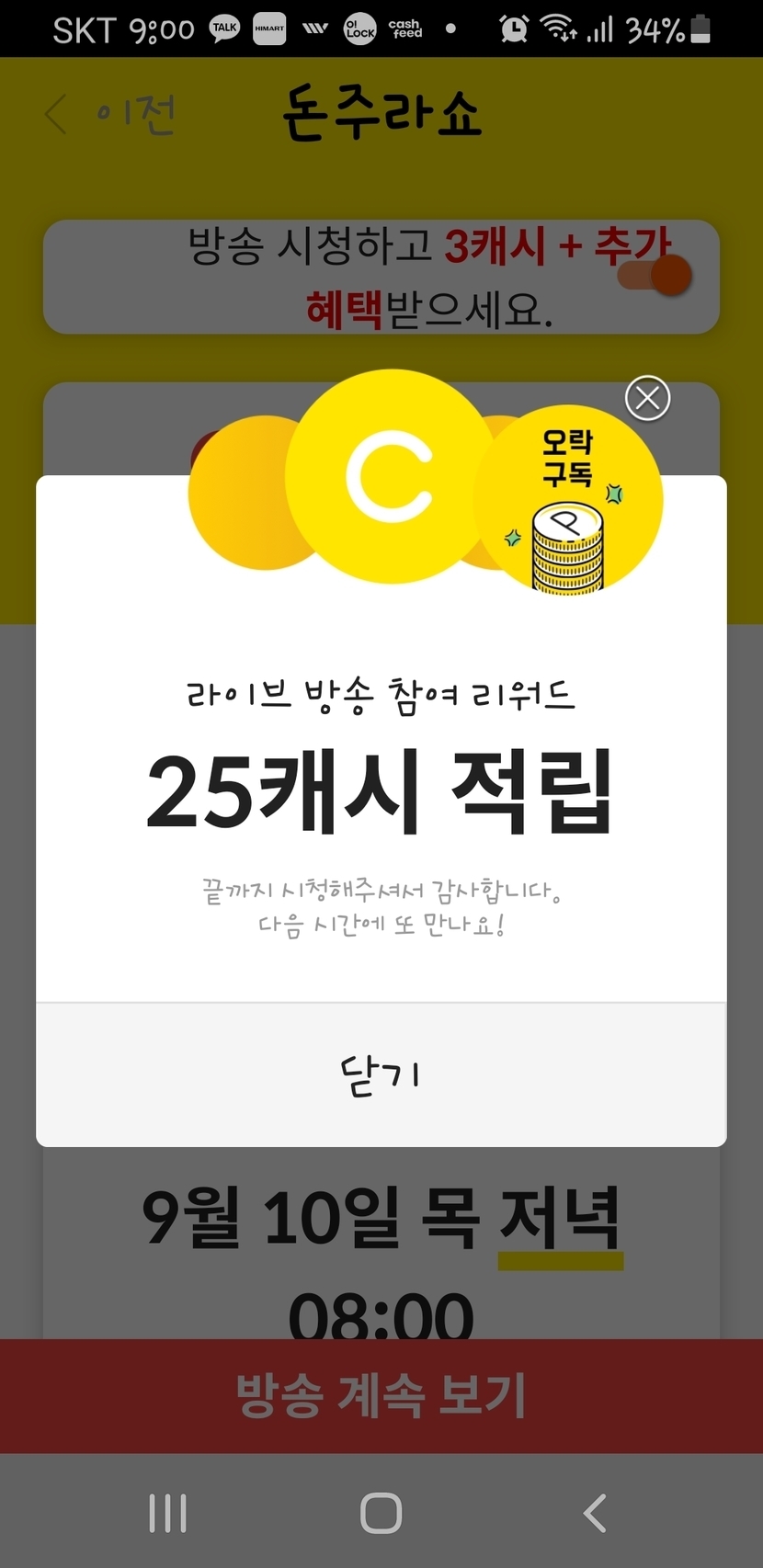 그러면 계속 방송이 시청되는 것으로 되어서 캐시를 많이 받을 수 있었어요