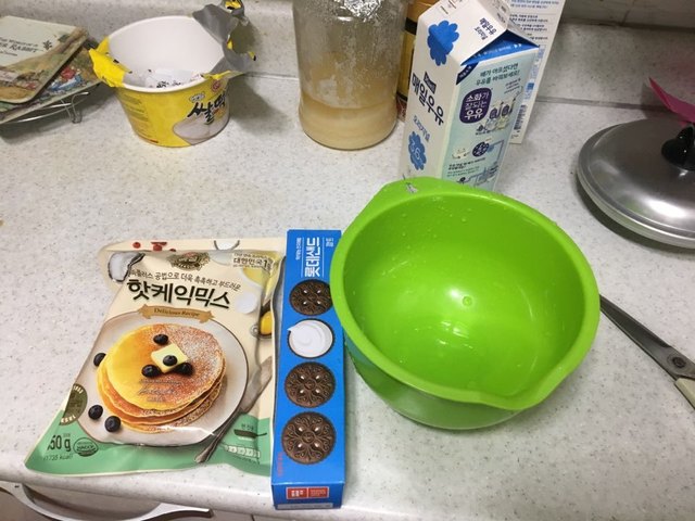 초록색 바가지(내가 초록색깔 씀 그니까 너네도 초록색으로 해 없으면 아무거나 반죽할 수 있는 그릇이면 상관없음),
