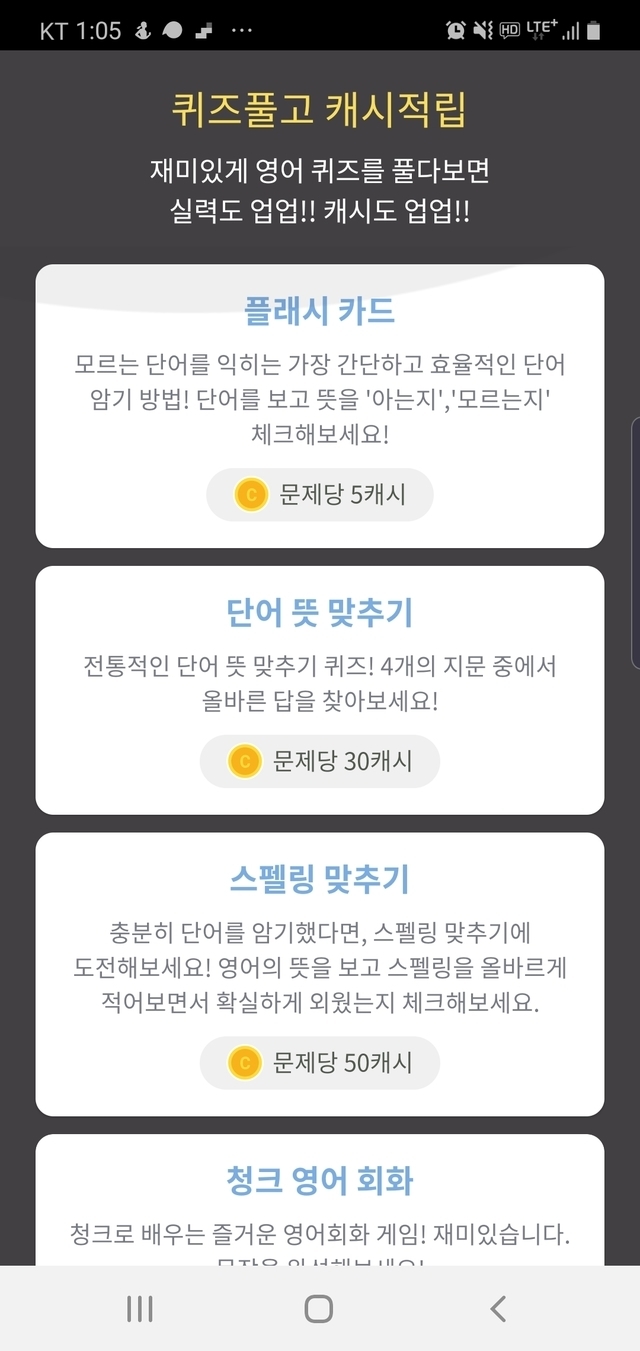 19.11.27 294 읽음 영어공부하며 리워드받는 어플 xxpan0707 구독하기 2 5 콘텐츠의 수익 126 이제는 영어 공부하면서 용돈벌이 할수있는 어플도 나왔네요^^그이름은 캐시보카이미지 보면 알듯이 레벨별로 캐쉬적립이 다르고요문제 레벨 상관없이 하루 100문제씩 풀면 금,은,동 메달을 줍니다 이메달들은 다시 캐시환전이가능하고요캐시아웃 문상 기프트카드모두있네요^^단점은 캐시보카 캐시 100원이 현금 1원이라 생각하시면됩니다3만원부터 환전가능하나 3만원환전을 위해서는 캐시 300만원을 모아야된다는거죠영어공부 열심히하면 금방가능하지않을까요?? ^^ 5 0 / 300 입력