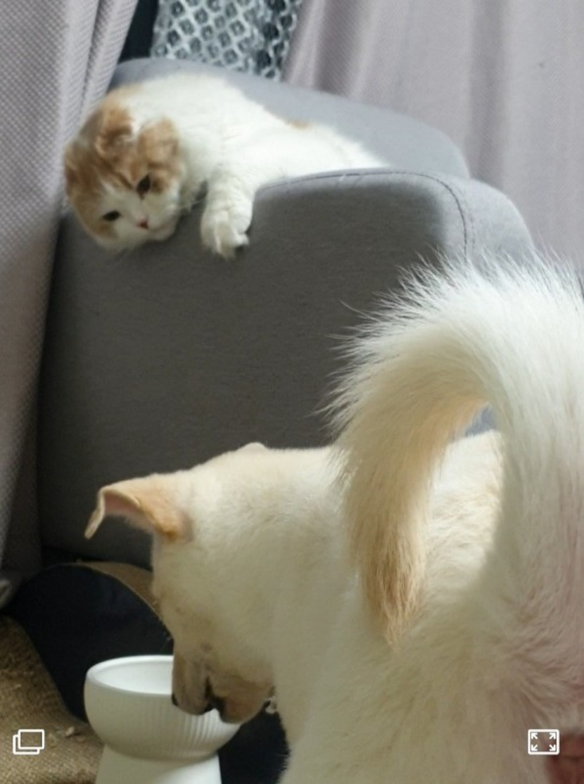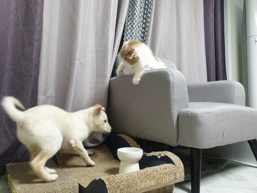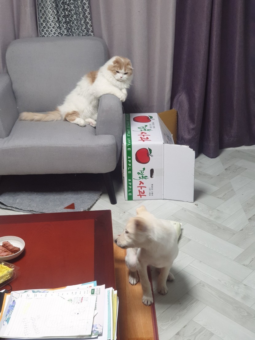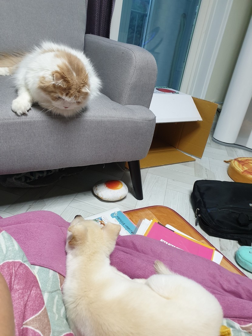 물론 냥이는 냥펀치날리기로 선빵을 때리고ㅎ 소파에 앉아 댕댕이 구경하고, 사고칠때마다 개한심 표정으로 쳐다봄ㅋㅋ