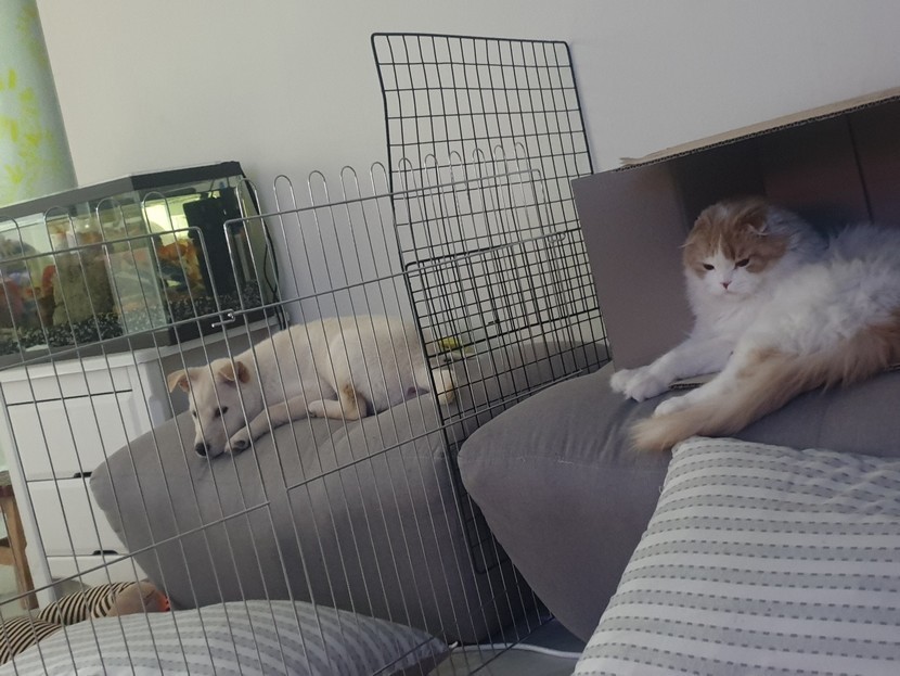 서로 냄새 익숙해진 다음 서서히 같이 있는 시간을 늘렸더니 서로 제법 관심을 가진다.