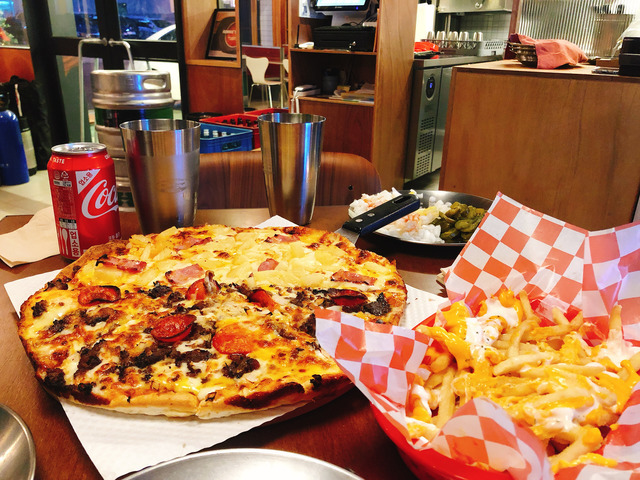 반짝이는 농구 골대 간판이 참 예쁜 곳이에요🙂11월인데 벌써 크리스마스트리도 있고 캐롤도 틀어놨던데 연말 분위기라 너무 예뻤어요 ㅎㅎ이 곳은 피자 두께와 크기를 먼저 선택한 후 주문하는데요. 저는 얇은 피자보다 살짝 도우가 도톰한 걸 선호해서 통통한 피자 두께와 레귤러 사이즈로 반반 피자를 주문했어요.그리고 치즈프라이가 있길래 주문했는데 정말 맛있었어요! 반반피자는 파인애플이 듬뿍 올라간 하와이안피자와 불고기피자로 반반 했는데 개인적으로 불고기가 더 맛있었어요 ㅎㅎ(고기사랑)그리고 셀프바에 가면 다진 양파를 갖다 먹을 수 있어서 느끼하지 않게 피자를 먹을 수 있답니다🙂 오랜만에 맛있는 피자를 먹어서 너무 기분이 좋았는데 여러분도 오늘 맛있는 금요일 보내세요🙂