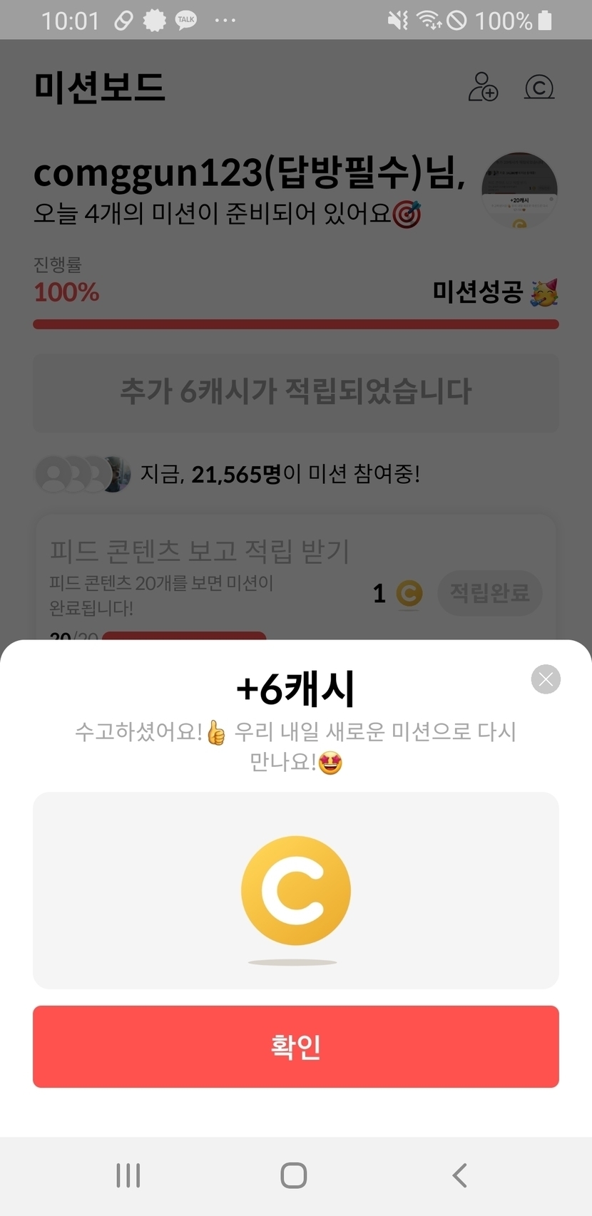 오늘미션 성공했어요. 캐피님들도 화이팅이요