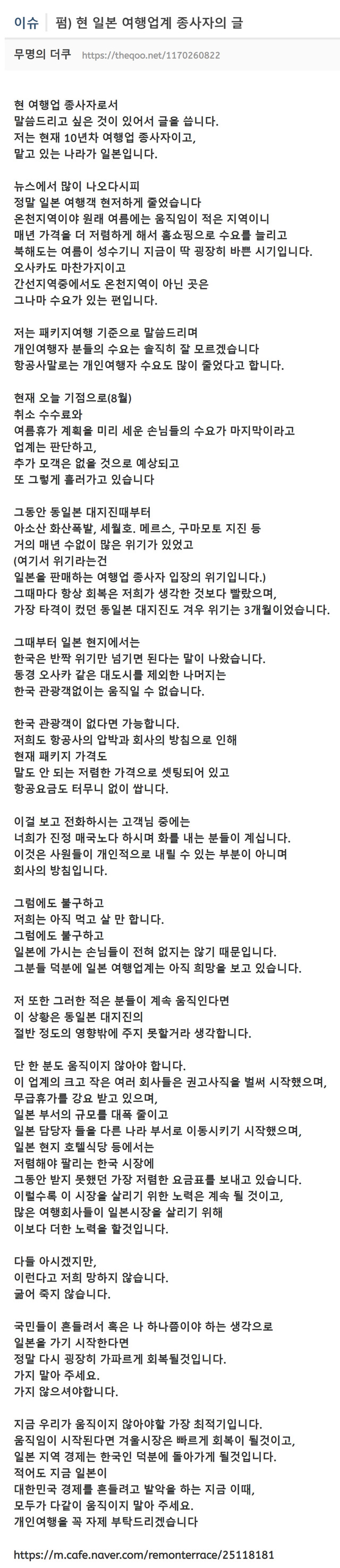 현 일본 여행업계 종사자의 글