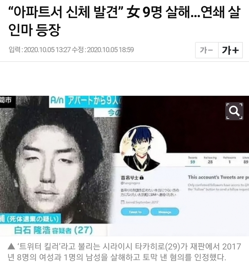20.10.17 120 읽음 이색 사건 여성 8명 트위트로 끌어들여서 죽인 살인마 choi.philip0326 구독하기 1 0 콘텐츠의 수익 7 SNS 범죄가 점차 많아지고 있는 요즘 정말 조심해야하는 사건이 또 터진거 같습니다 ㅠhttps://ironrevolution.tistory.com/m/6오히려 이런 일들 때문에 아예 계정을 비공개로 바꾸는 사람들도 많이 계신거 같습니다 ㅠ 0 0 / 300 입력