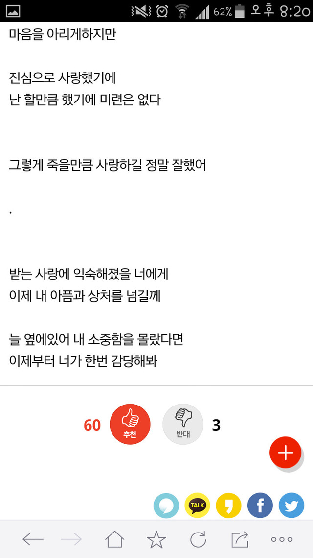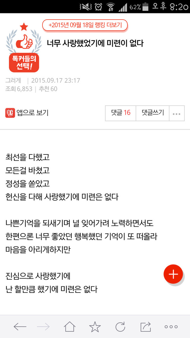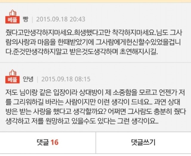 19.08.09 352 읽음 [네이트판] 너무사랑했었기에 미련이없다 (feat.현실적인베플) 오로라고래 구독하기 1 3 콘텐츠의 수익 0 본인의 소중함을 깨우치고 감당해보라는게 난 미련의 일종이라고 생각함진짜 미련 없으면 그런 생각도 안들더라고 3 0 / 300 입력