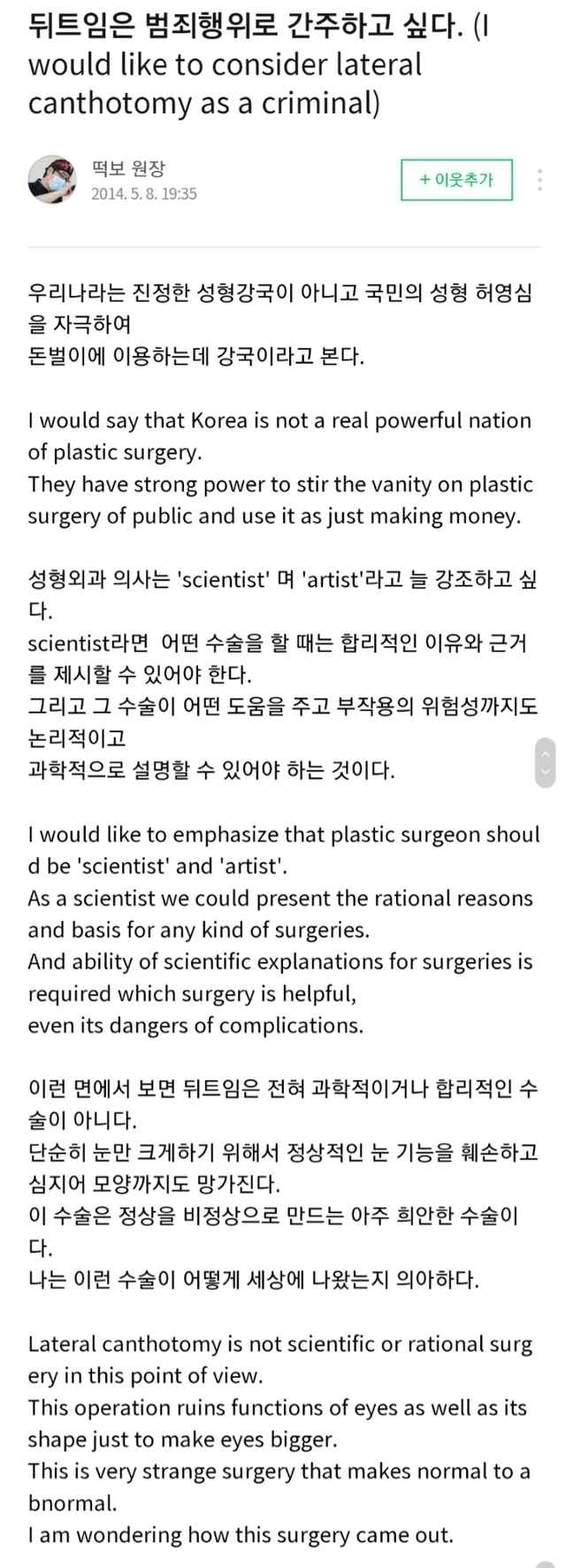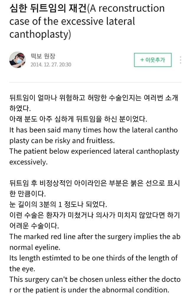 성형외과의사선생님이 그건 사람눈을 병신으로 만드는 수술이라고 절대 하지말라고 양심적으로 말하는거라고 하셨거든