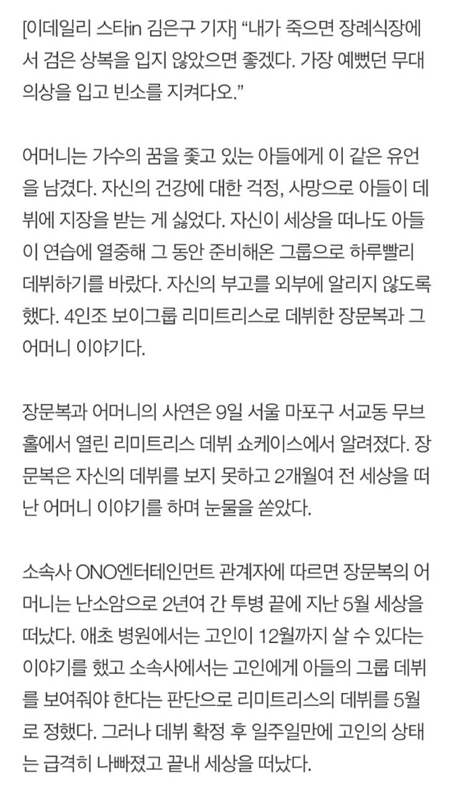 19.08.09 140 읽음 무대 의상 입고 어머니 장례식 치른 장문복 fn4kPM 구독하기 0 0 콘텐츠의 수익 0 그룹 데뷔한 이유도 돌아가신 어머니가 그룹으로 데뷔한 아들 모습보고 싶다고해서... 세상 맴찢... 0 0 / 300 입력