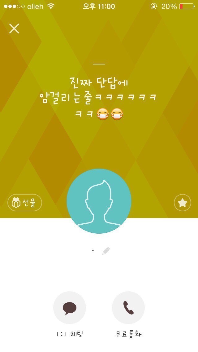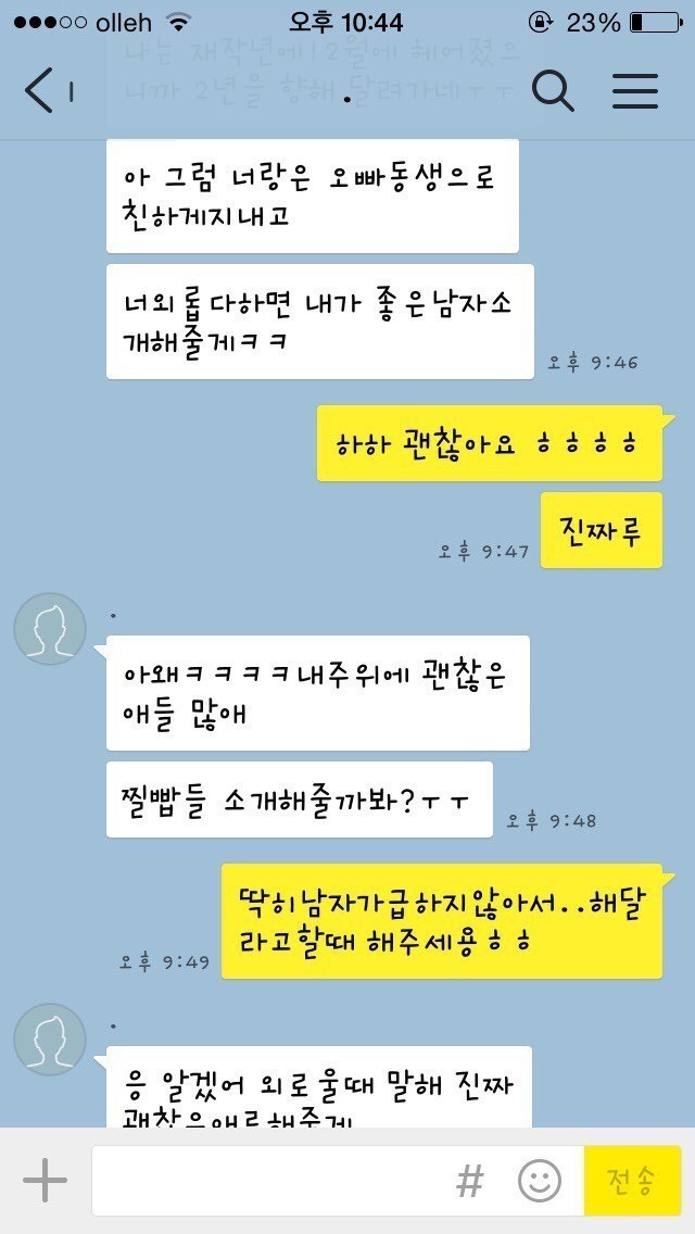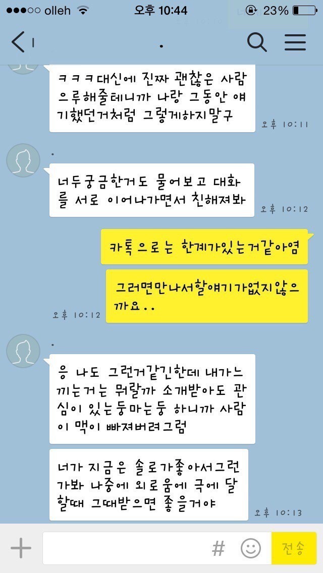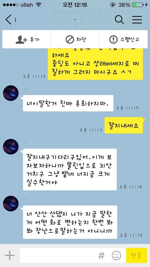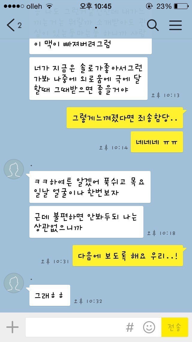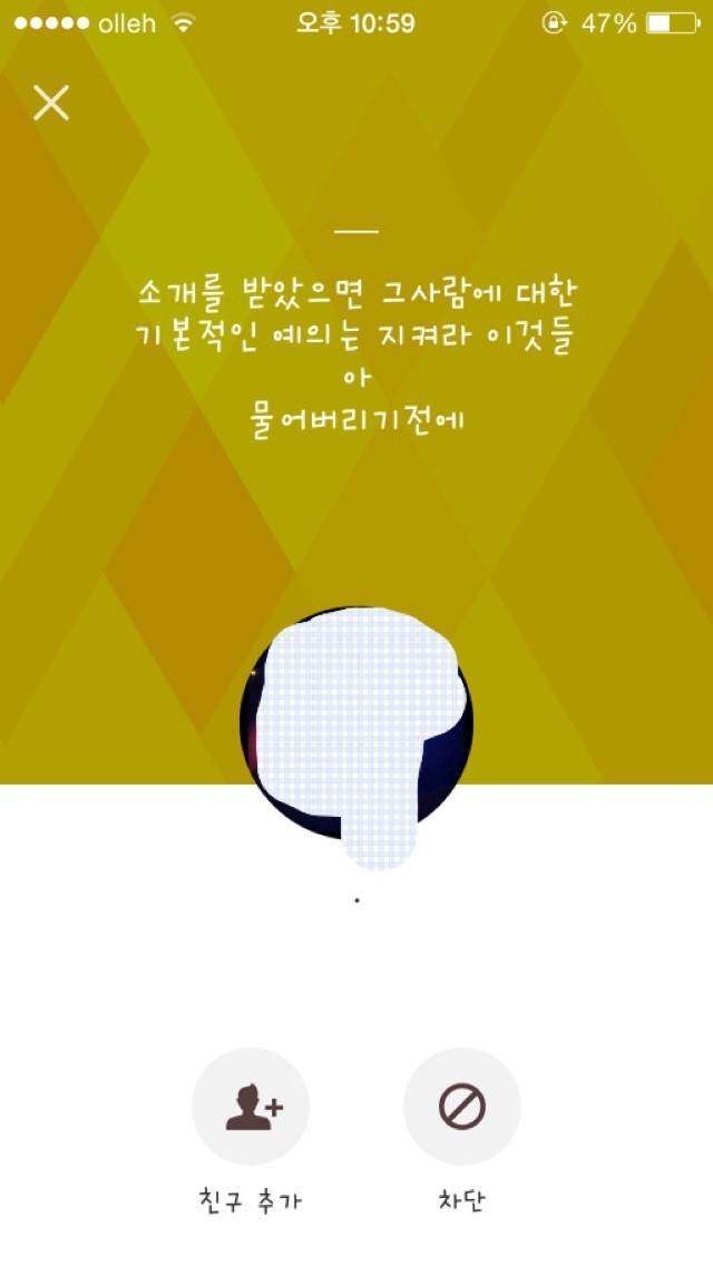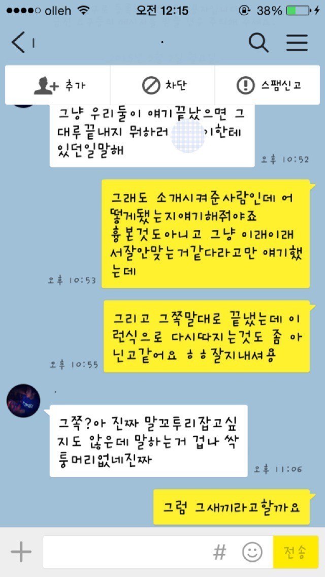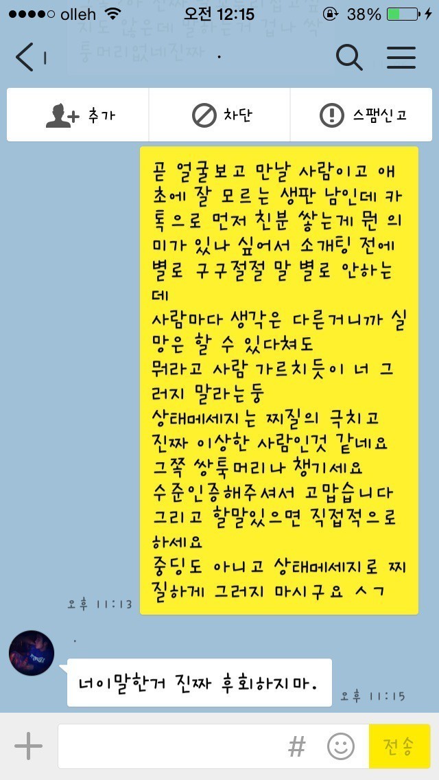 19.08.10 198 읽음 남자가 봐도 찌질한, 28살 소개팅남 카카오톡 fX31S1 구독하기 1 0 콘텐츠의 수익 0 1. 글쓴이의 아는 오빠 친구가 글쓴이의 페이스북 사진을 보고, 마음에 든다며 친구에게 글쓴이를 소개해달라 함2. 소개받을 생각이 별로 없었는데 아는 오빠가 연락처를 알려주었고, 그 뒤로 남자에게서 카카오톡 메시지가 옴3. 글쓴이는 아직 만나지도 않은 상태에서 잦은 대화는 의미없는 것 같아 단답식으로 대답4. 계속 메시지를 보내도 글쓴이가 별 반응이 없자 남자가 보낸 메시지5. 소개팅남의 카카오톡 프로필6. 글쓴이가 ~이러이러해서 만나지 않기로 했다고 아는 오빠에게 말했더니 소개팅남에게 메시지가 왔음28살. 덜덜해 0 0 / 300 입력