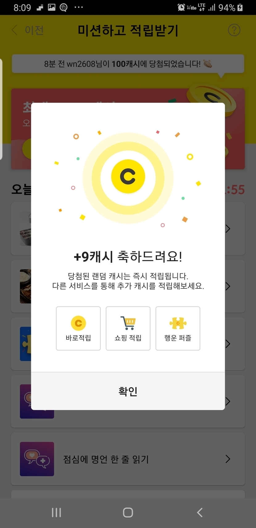 오늘도 즐겁게 미션완료하고 캐시 얻고 가네요