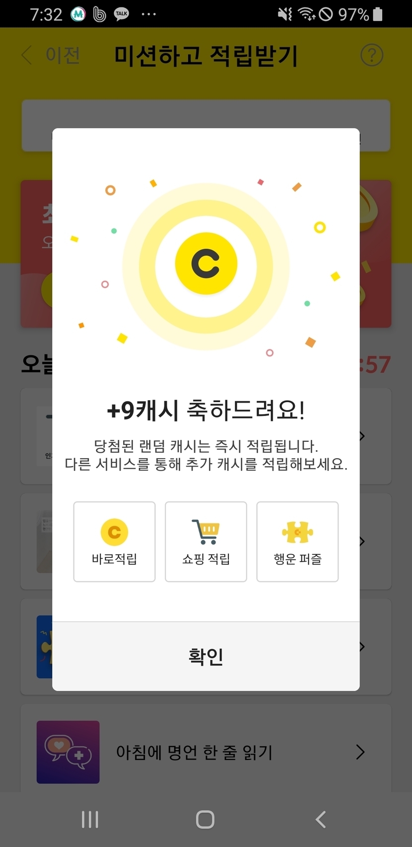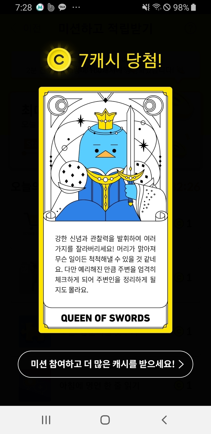 20.10.24 132 읽음 오늘 미션성공인증 comggun123(답방필수) 구독하기 19 20 콘텐츠의 수익 14 보물도 찾고 타로카드랑 미션성공했습니다. 보물이 보물맞나? 1캐시는 심하네~ 20 0 / 300 입력