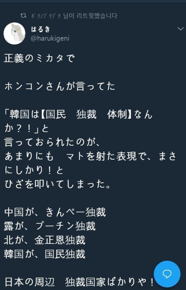 19.08.11 687 읽음 일본의 혐한극우가 깨달은 한국의 진실.jpg 얼음공장 구독하기 0 5 콘텐츠의 수익 0 (트윗 번역)한국은 국민 독재 체제가 아닌가?" 라는 말이 너무나도 정곡을 찌르는 표현이라무릎을 탁 치고 말았다.중국은 시진핑 독재러시아는 푸틴 독재북한은 김정은 독재한국은 국민 독재어떻게 된게 일본의 주변국들은 독재국가들 뿐인거냐!!국민독재 = 민주주의하긴 중세 잽랜드 농노들이 민주주의를 경험해봤어야 알지ㅋㅋㅋㅋㅋㅋㅋㅋㅋㅋㅋ 5 0 / 300 입력