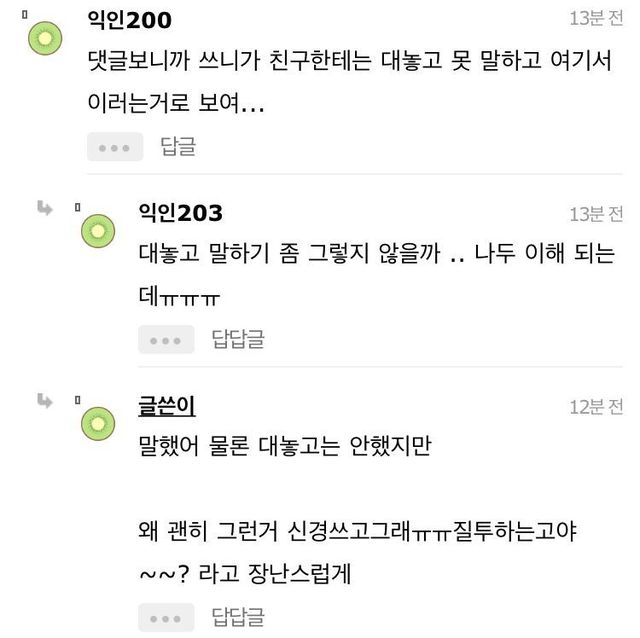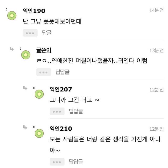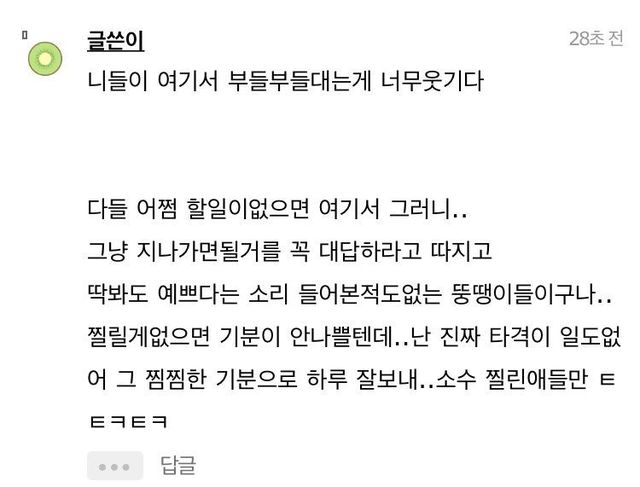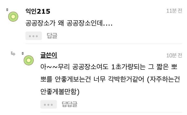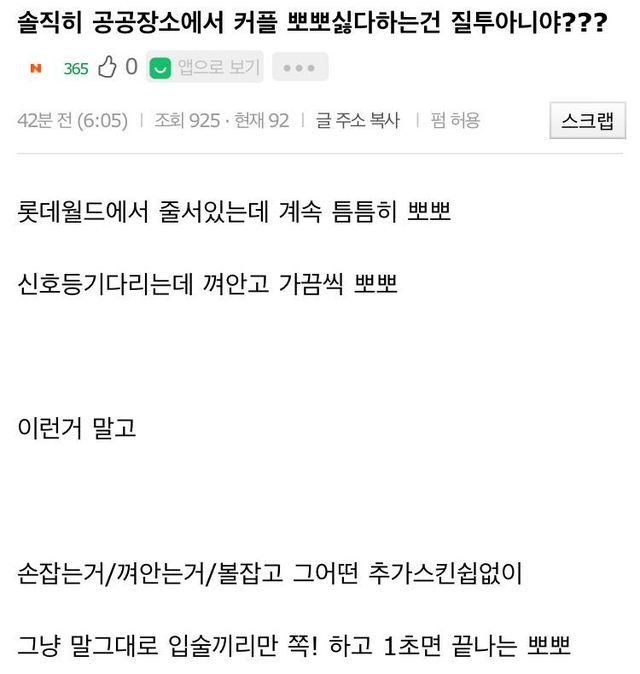 19.08.12 228 읽음 솔직히 공공장소에서 커플 뽀뽀 싫다하는건 질투아니야?.instiz 치와와왕 구독하기 0 0 콘텐츠의 수익 0 갑분 뚱땡이저긴 정말 사고회로 신기한 애들 많은듯키스하고 싶고 뽀뽀하고 싶으면 모텔 잡고 하라고 남들 앞에서 하지 말고 ;; 0 0 / 300 입력