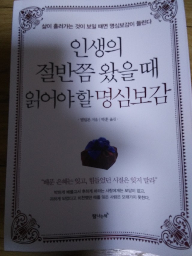 19.12.02 54 읽음 명심보감 읽기 도전 나도너도 구독하기 2 3 콘텐츠의 수익 27 몇달전 서점에서 보고 읽어보려고 위시 리스트에 올려놓은 책.드디어 구입덕분에 한자 공부도 자연스럽게.꾸준히 읽어야지. 도전.총 271쪽 3 0 / 300 입력