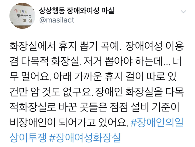 휴지 뽑기 곡예하라고 만들어놓은 장애인 화장실.twt