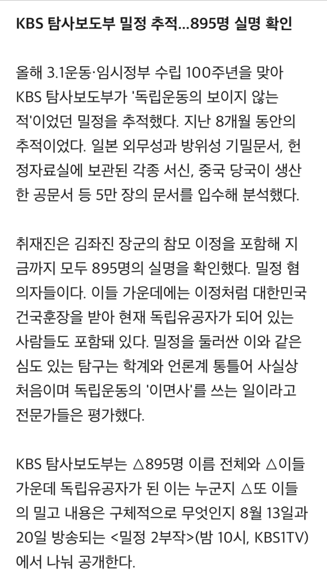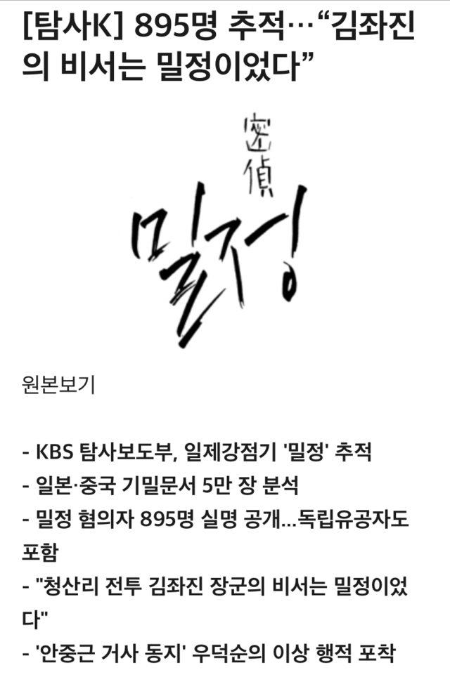 19.08.13 235 읽음 탐사k 895명 추적…“김좌진의 비서는 밀정이었다” 37K0K3 구독하기 0 0 콘텐츠의 수익 0 <중략>친일파 후손들 또 개부랄 떨겠구만 우리 조부 증조부 욕보이지 말라면서 0 0 / 300 입력