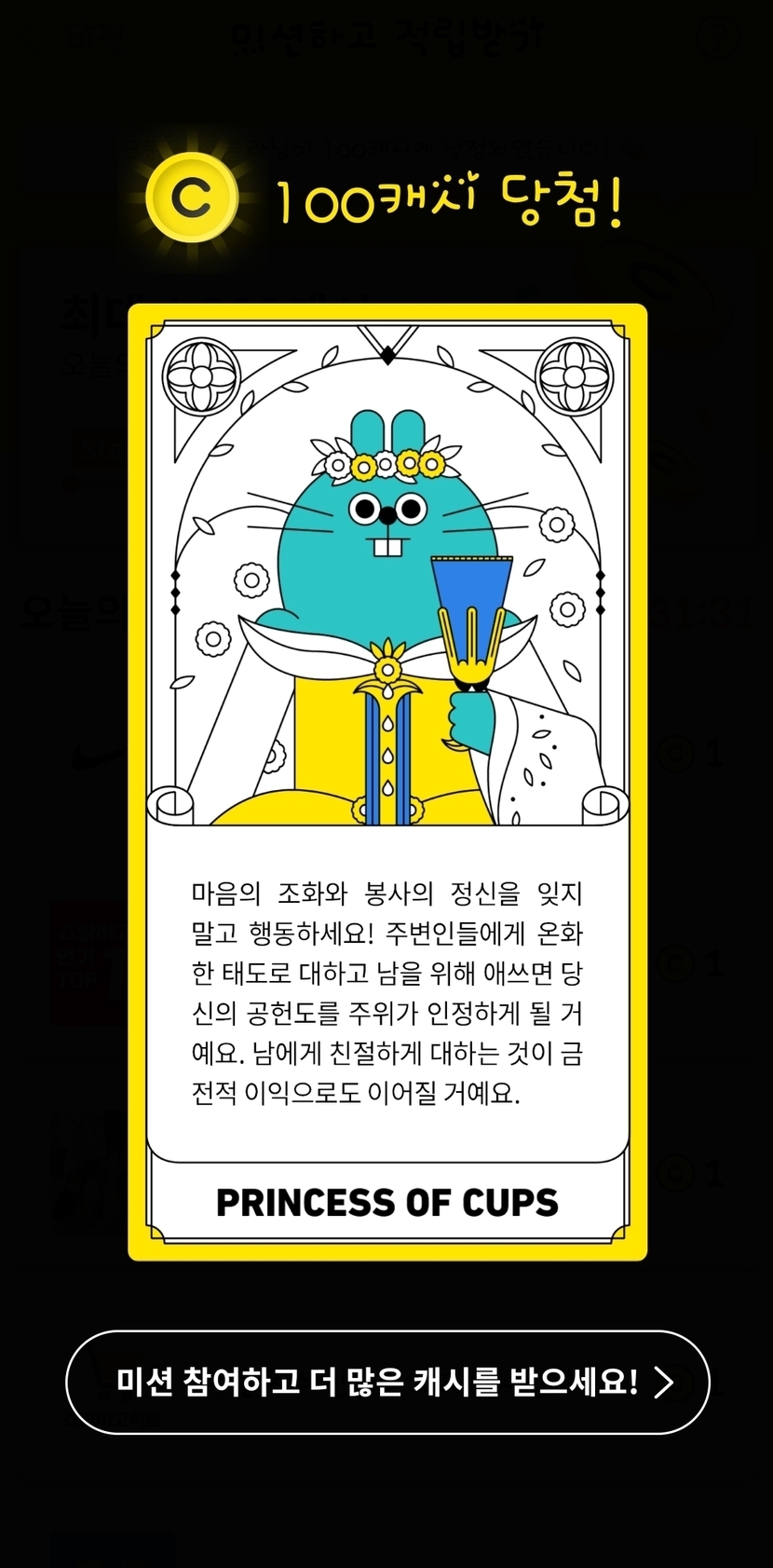 20.11.07 154 읽음 행운타로 aba2 구독하기 29 26 콘텐츠의 수익 24 안녕하세요주말이 왔네요오늘도 미션 달성 하기위해 캐시슬라이드 접속했는데미션하기 전에 행운타로를 꼭 하게되죠늘 좋은 말이 있어서 얼마를 받든 상관이 없었죠그런데 행운타로에서 처음으로 100캐시 받아보네요이번 주말 뭘 할지 고민이 많은데요즐거운 토요일이고 100캐시 받아봤으니 기분전환좀 하려구요그럼 즐거운 주말 보내시고 좋은일만 가득하세요 26 0 / 300 입력
