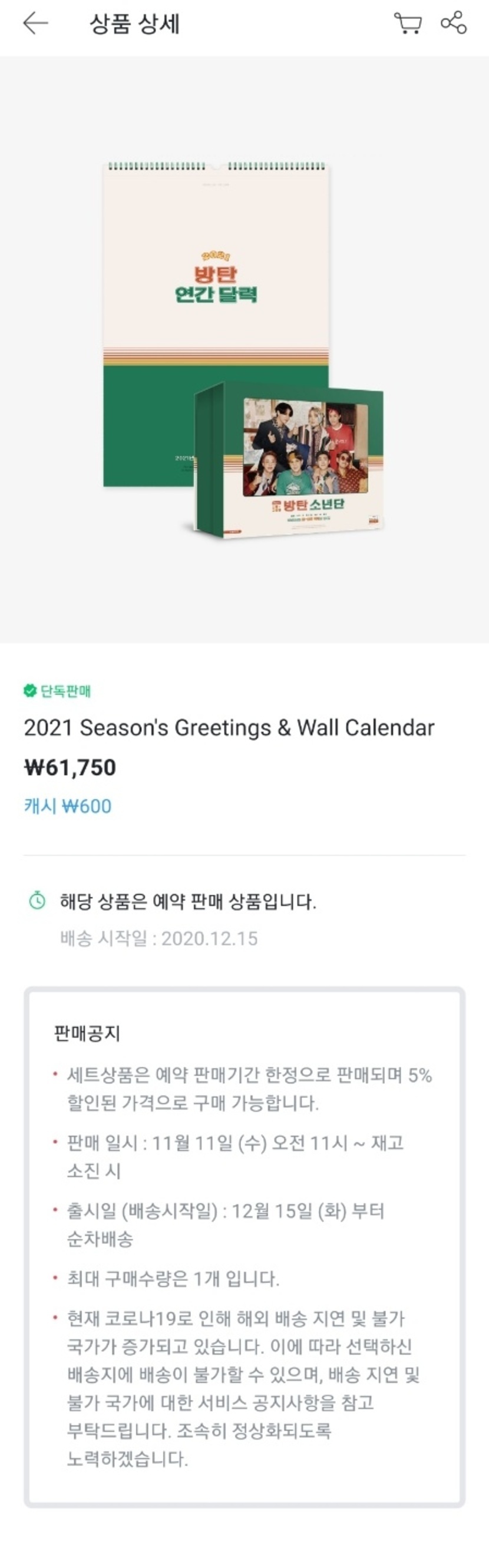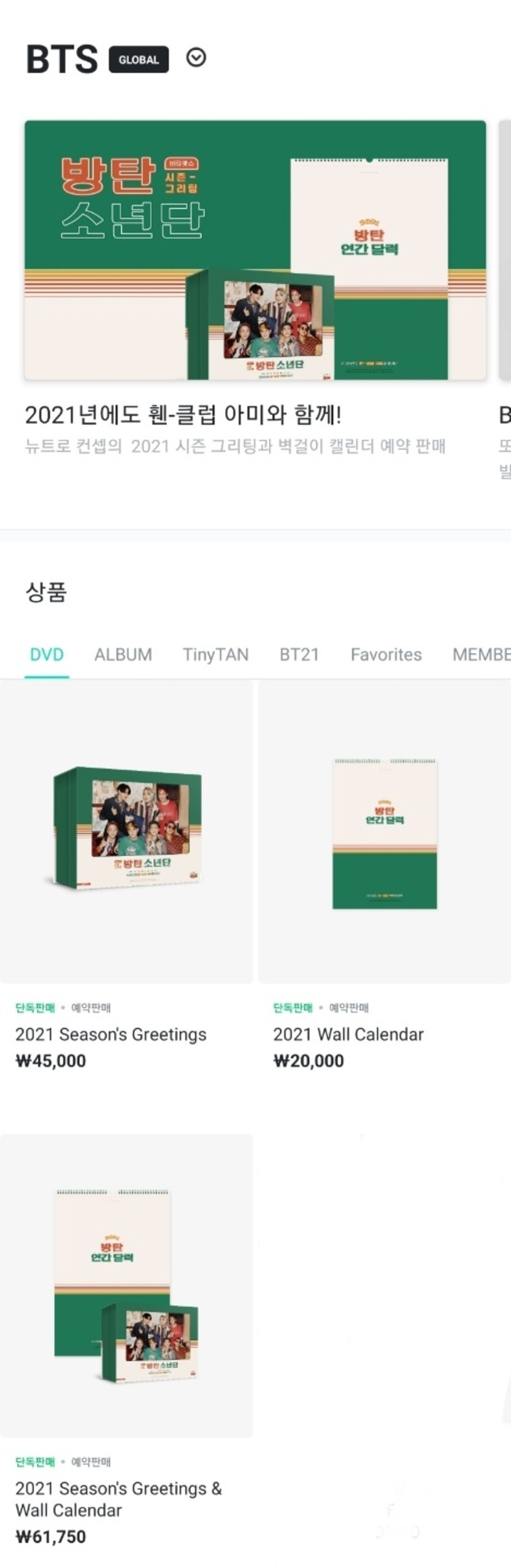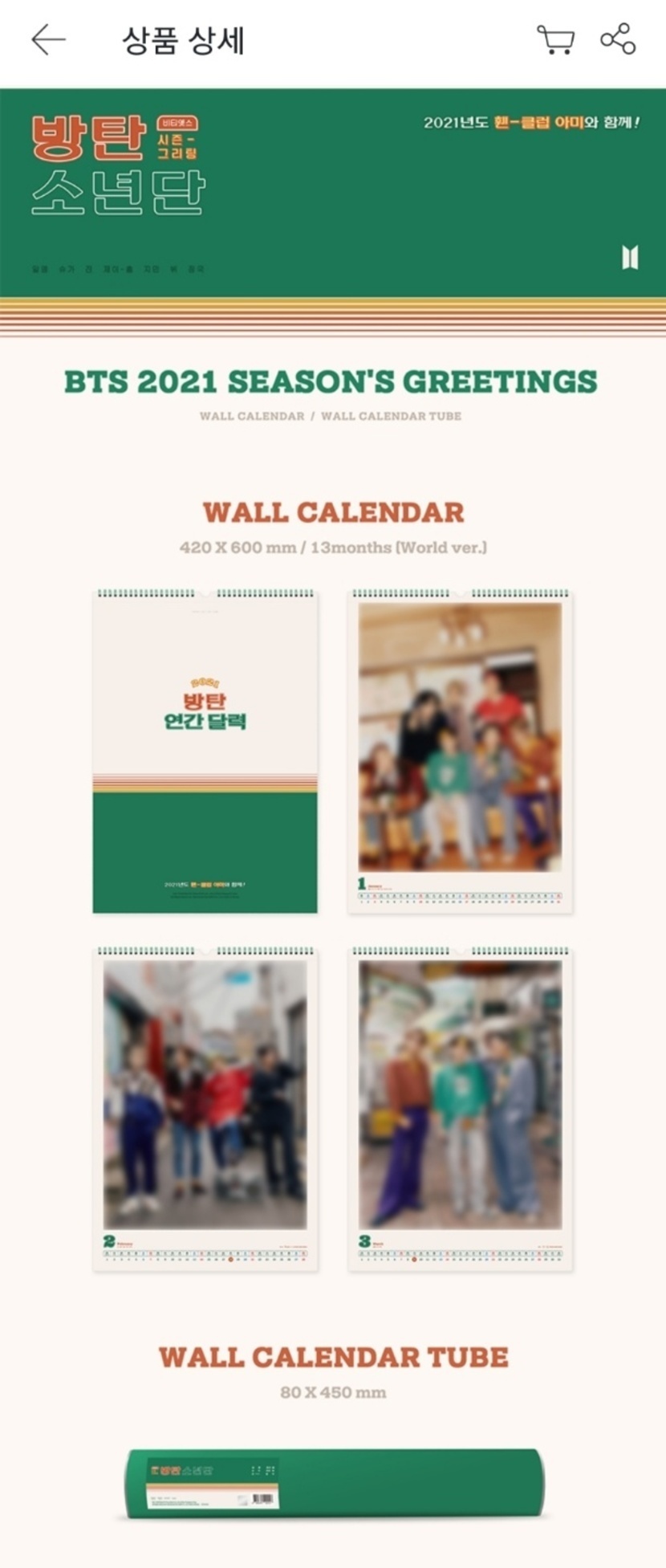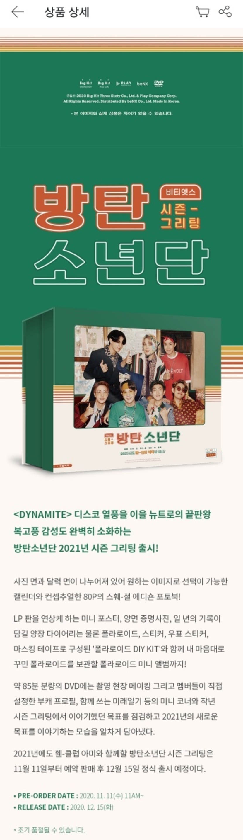 방탄소년단 2021 시즌그리팅 예약판매