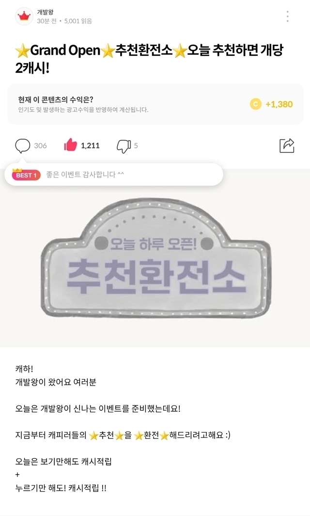 19.12.04 94 읽음 이벤트 떴어요 행운만땅대박나라 구독하기 0 30 콘텐츠의 수익 21 오늘까지 추천 개당 2캐시 최대 100개 총 200캐시에요 ㄱhttps://www.cashfeed.co.kr/posts/295653 30 0 / 300 입력