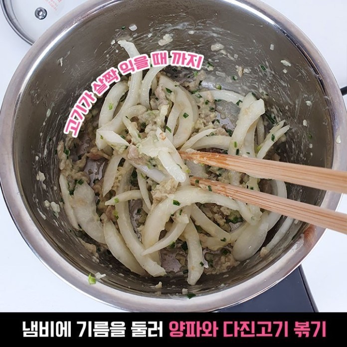 기름을 두르고 양파와 다진 고기를 먼저 볶아