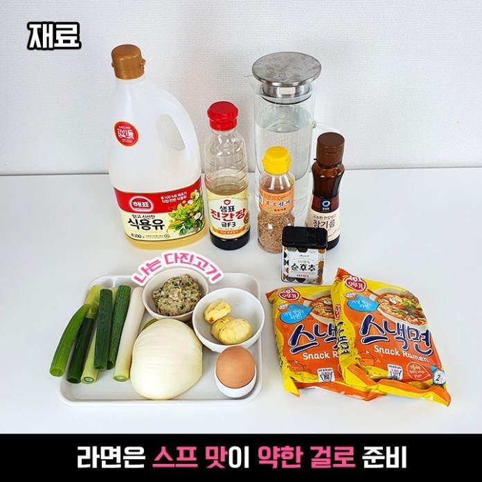 라면 1개, 대파 약간, 양파 1/4개, 계란 1개, 다진 고기 1/4컵, 식용유, 진간장, 참기름.