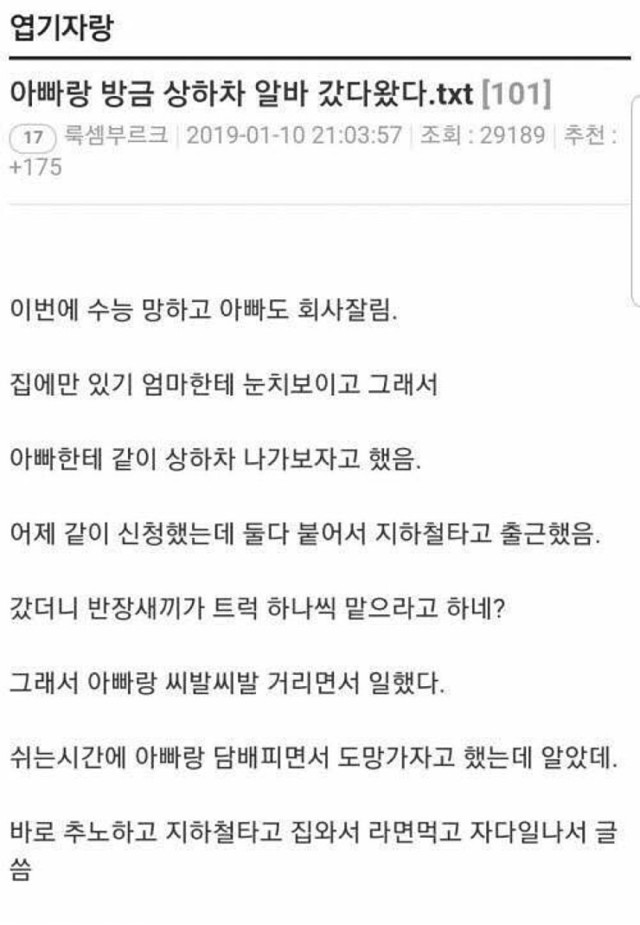 19.08.16 649 읽음 아빠랑 상하차 알바 다녀온 썰 8048dQ 구독하기 1 1 콘텐츠의 수익 0 아무리 정신차리려고 일하려고 해도상하차 알바는 절대 할 게 못 되는 듯하면 병원비가 더 나온다는 말 ㄹㅇ임 1 0 / 300 입력
