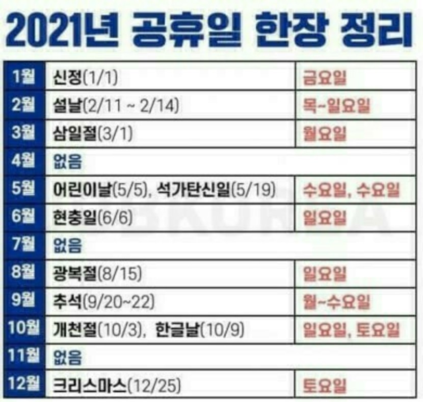 한눈에보는 2021년 공휴일~