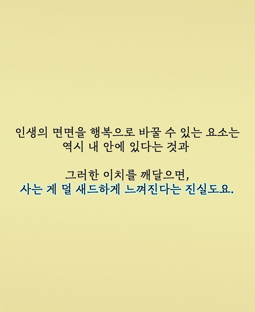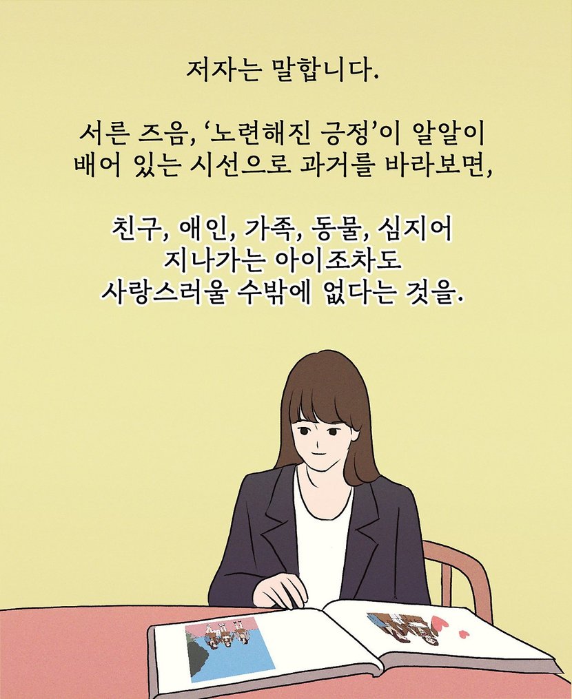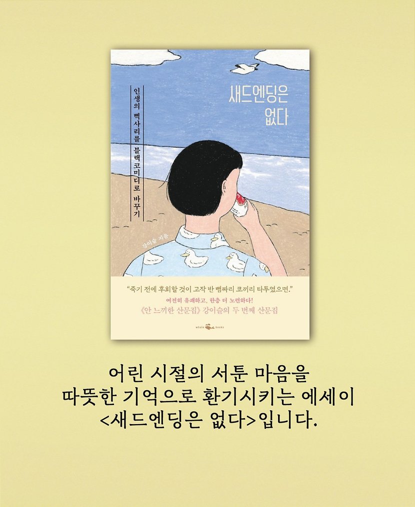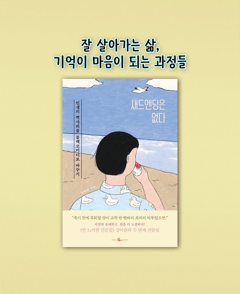 8090년대생은 공감하는 '이것'으로 친구 가르던 시절어린 시절의 서툰 마음을 따뜻한 기억과 더 나은 날로 나아가는 용감한 한 걸음으로 환기시키는 과정에서 우리에게도 지금을 지탱하는 과거의 기억이 있음을 떠올린다. 모두에게 있을 법한 걱정과 우울과 불안의 해소법을 《새드엔딩은 없다》를 통해 만나보자. 기억이 단지 기억에 그치지 않고 마음이 되는 과정들을 따라가다 보면, 알게 된다. 그 모든 불행을 행복으로 바꿀 수 있는 요소 역시 내 안에 있다는 것을. 인생의 삑사리를 블랙코미디로 바꾸기 <새드엔딩은 없다>