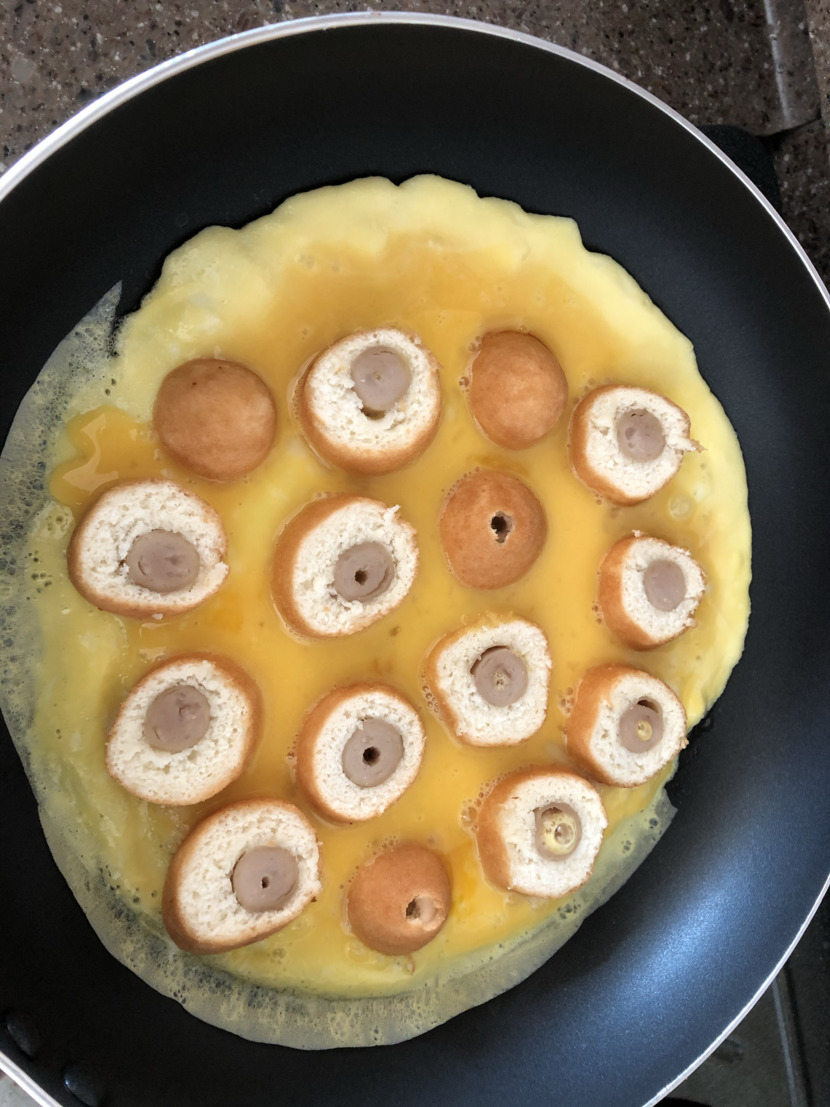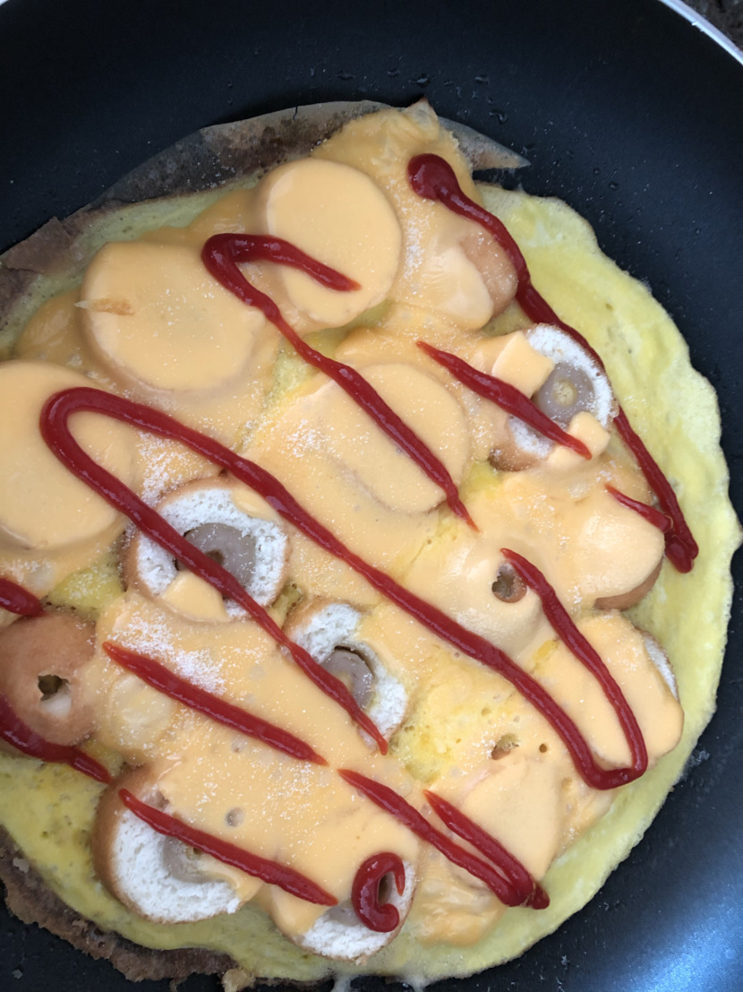 계란 풀어서 후라이팬에 넣고 핫도그 전자렌지에 2개를 2분 돌려준뒤 잘라서 후라이팬 위에 살포시 놓아주고요