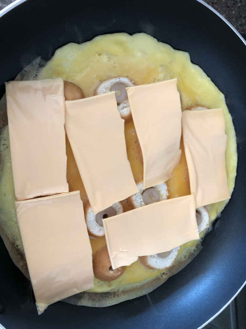그 위에 치즈 놓아줍니다. 저는 치즈가 이것밖에 없는데 김민경은 모짜렐라 치즈 넣드라구요. 치즈는 다 맛있을 것 같아요 ㅎㅎ